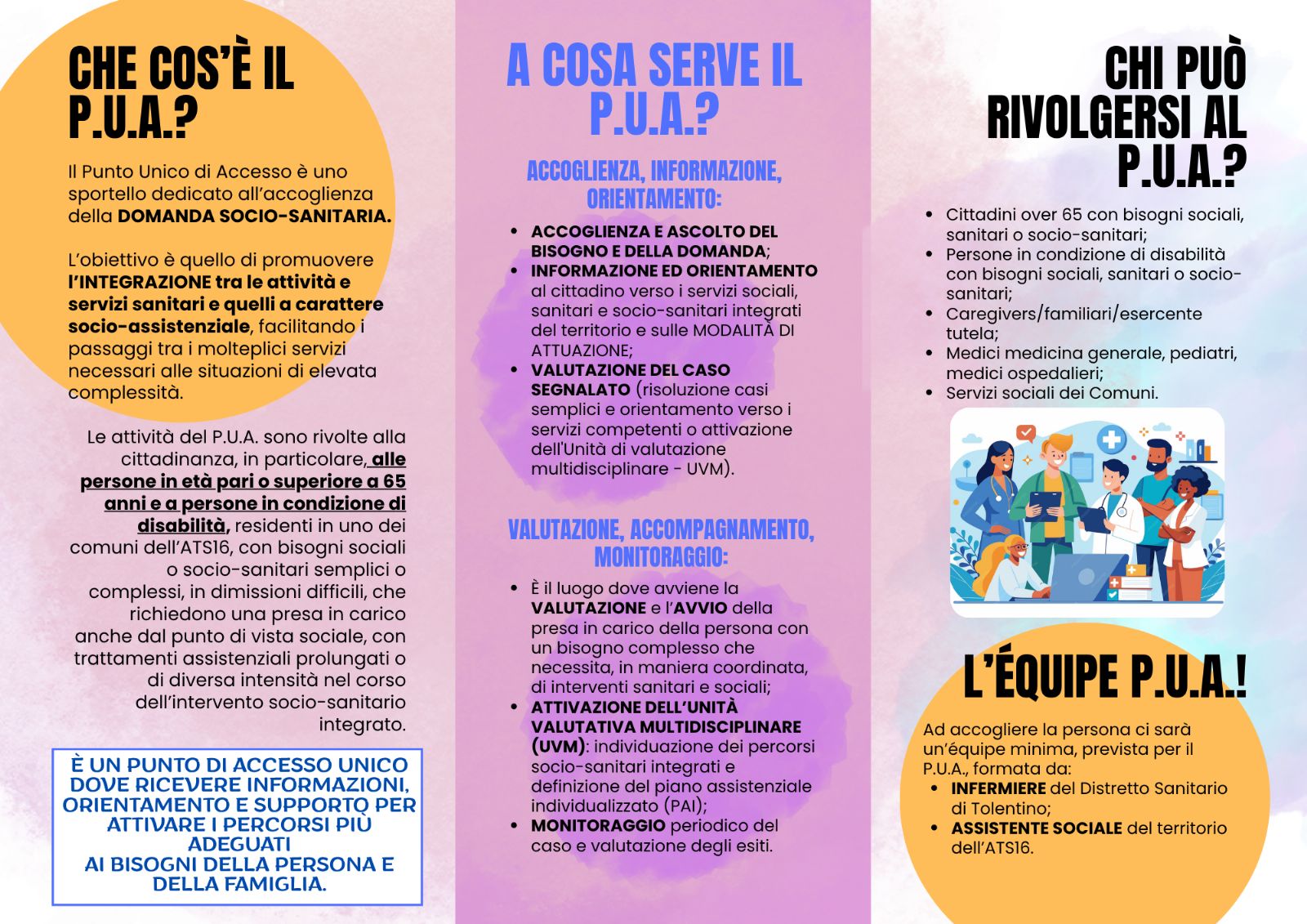 • Il PUA (Punto Unico di Accesso) è un servizio territoriale sociosanitario integrato, solitamente situato nelle Case di Comunità o distretti ASL. Facilita l'accesso ai cittadini per cure domiciliari, assistenza anziani/disabili e bisogni complessi, unificando le procedure sanitarie e sociali.